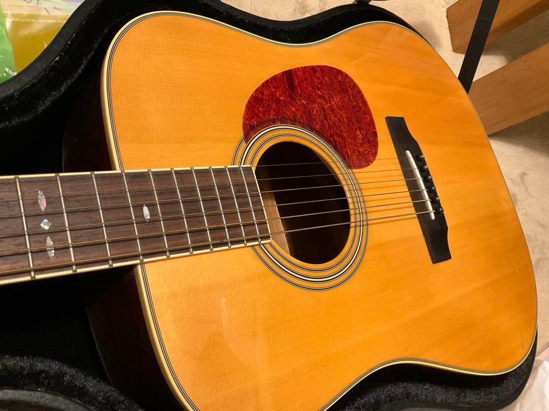 アコースティックギター Morris W-25 木目の綺麗なジャパンビンテージ 美品の出品です。シリアルNoは1608**で、F.Yamadaのサインがあります。ヘッド裏面にMORRISの捺印があり製造当時のオリジナルと思います、長い年月を経過していますが大きなダメージが無く美品と思います。日本では1970年代はフォークブームに乗って各種ブランドメーカーが競い合ってフォークギターを製造していました。現在では日本国内で生産しているメーカーは数えるほどで、また、とても高価なものだけのようです。このギターは合板ですが、現在では、その当時の最高な材料と最高の職人によって製造された貴重なものと思います。出音は合板ですが独特のきらびやかな音色と音量のサウンドバランスで当時の中級のコストパフォーマンスのモデルですが、外観も含め非常に素晴らしいと思います。TOP材は素晴らしい材料で目のつんだところは1mm以下の部分もあります。フレット残りも8分位で、全体の使用感が少なく、ヘッドに擦り傷はありますが角打ちや打痕は無くペグもとてもきれいです。ネックはまっすぐで弦高さは5フレット1弦で2mm、6弦約2,2mm位で、12フレット1弦で2,4mm、6弦約3mm位ビビりや音つまりはありません。ネックのナット巾は43mm、弦長は652mm位です。ブリッジサドル凸は1弦、6弦で共に3,5mmあり、弦の高さは必要に応じて低く調整が可能です。その他、2025年8月に新品の弦に貼り替えと内外部をクリーニング済で全体の外観は自然にエージングされてますが古さを感じないものです。ピックガード下側に薄い凹傷が一か所あり、裏板に少しの白濁と浅い擦り傷がありますが概ね綺麗です。その他は写真にて確認していただき記載しきれない小さな小傷に関してはご了承ください。付属品は当時のハードケースで、金具に錆がありますが概ね綺麗と思います。内部にミラーマット、外装にエアーキャップを使用して、輸送時に振動や衝撃に十分に耐えられる様に梱包して発送します。 本品は、年式が経過した中古ビンテージ品ですので、ご理解、ご納得の上よろしくお願い致します。